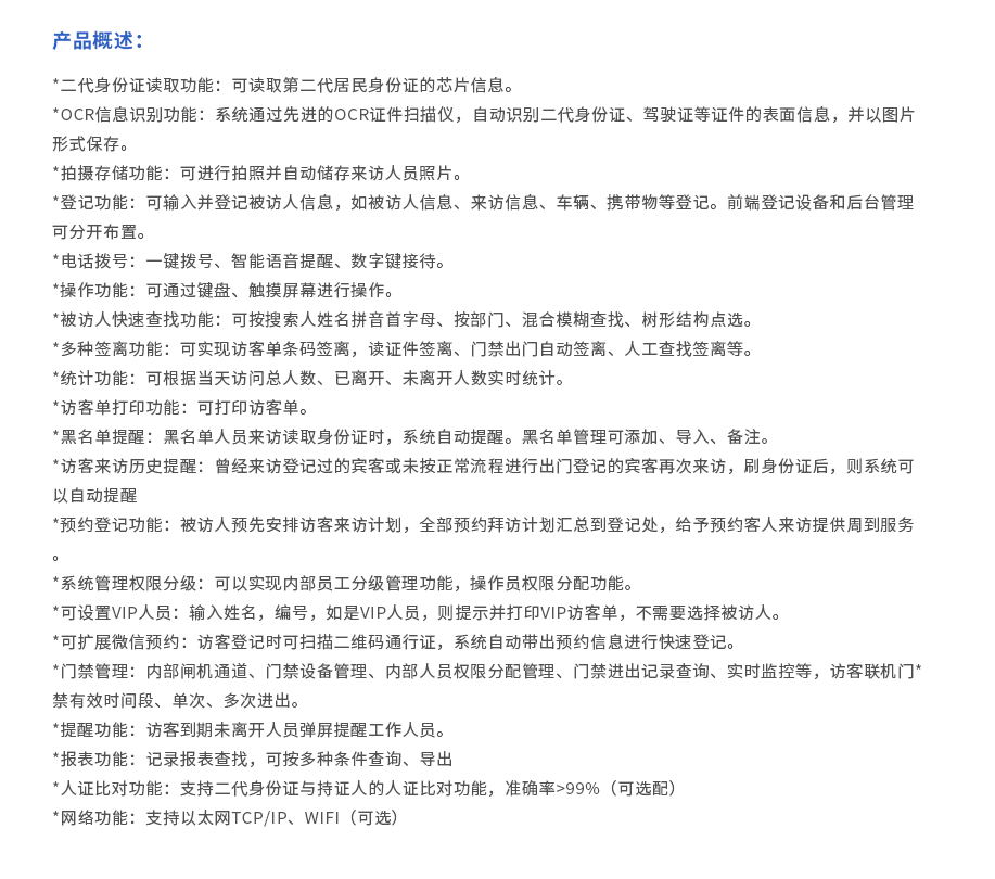 l 二代身份證讀取功能:可讀取第二代居民身份證的芯片信息。 l OCR信息識別功能:系統通過先進的OCR證件掃描儀,自動識別二代身份證、駕駛證等證件的表面信息,并以圖片形式保存。 l 拍攝存儲功能:可進行拍照并自動儲存來訪人員照片。 l 登記功能:可輸入并登記被訪人信息,如被訪人信息、來訪信息、車輛、攜帶物等登記。前端登記設備和后臺管理可分開布置。 l 電話撥號:一鍵撥號、智能語音提醒、數字鍵接待。 l 操作功能:可通過鍵盤、觸摸屏幕進行操作。 型號:CS-FK2610