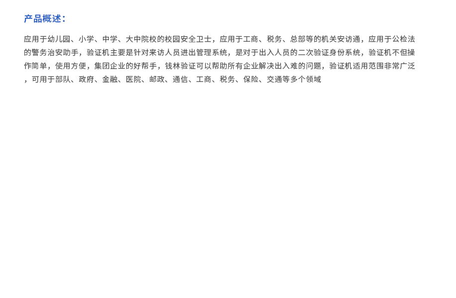 應用于幼兒園、小學、中學、大中院校的校園安全衛士,應用于工商、稅務、總部等的機關安訪通,應用于公檢法的警務治安助手,驗證機主要是針對來訪人員進出管理系統,是對于出入人員的二次驗證身份系統,驗證機不但操作簡單,使用方便,集團企業的好幫手,錢林驗證可以幫助所有企業解決出入難的問題,驗證機適用范圍非常廣泛,可用于部隊、政府、金融、醫院、郵政、通信、工商、稅務、保險、交通等多個領域