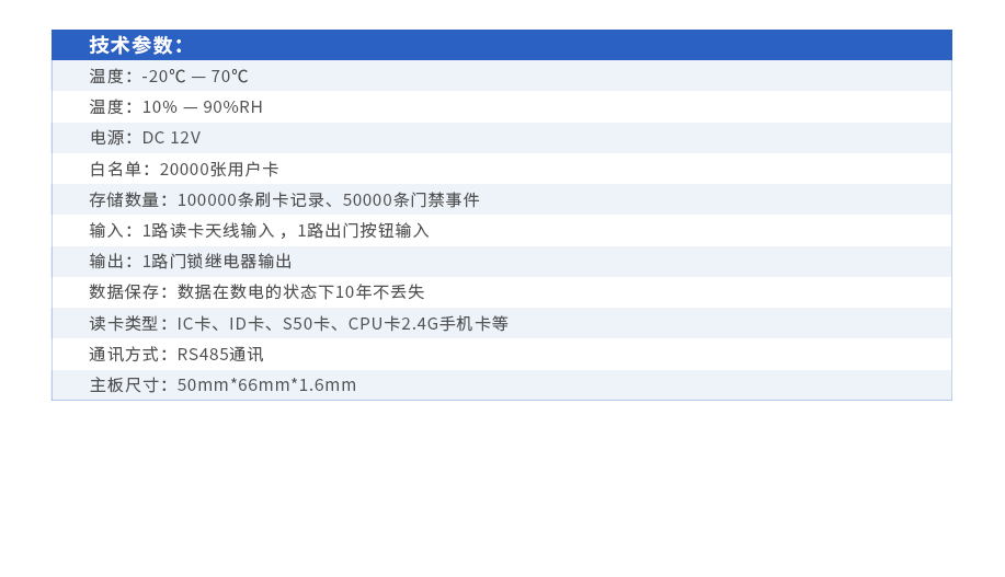 采用32位RAM處理器,處理速度更快 用戶卡分為時段卡和全通卡,用戶時段卡可支持24個控制器,全能卡支持128個控制器 用戶時段卡是通過設定卡片有效時間,實現卡片只能在有效期內刷卡進門,過期不可繼續使用門禁功能,如還需加時使用可到管理部門修改有效使用時間即可 支持8位拔碼開關設置門禁控制器地址 支持外接語音控制板,可播報語音 支持外接條屏顯示板,可顯示信息 自帶讀卡開線,無需外接讀頭,兼容韋根26/韋根34 在上位機軟件上制作設置支持延時卡,可根據需求改輸出端的開