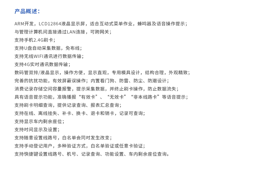 32位ARM內核處理器,數碼管雙排/液晶顯示 有聯網和脫機兩種工作模式 有計算器、份飯、菜號等多種消費模式,方便消費操作,且可自由切換 自動對所有消費記錄進行統計處理。生成各種明細表、匯總表,如:按餐、按日、按月、按年、按個人、按個人、按部門、按食堂、按終端、按售飯窗口等多種報表 蜂鳴器及語音操作提示 與管理計算機間直接通過LAN連接,可跨網關 單網段最大聯網255臺;多網段對聯網數量無限制 支持在售飯機上直接查詢該餐或該天累計