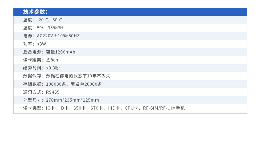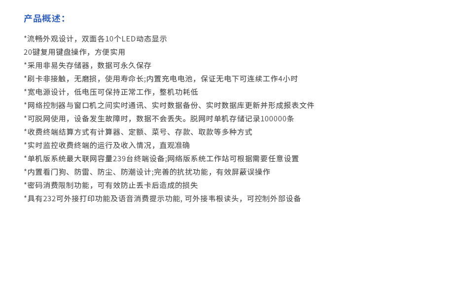 流暢外觀設計,雙面各10個LED動態顯示 20鍵復用鍵盤操作,方便實用 采用非易失存儲器,數據可永久保存 刷卡非接觸,無磨損,使用壽命長;內置充電電池,保證無電下可連續工作4小時 寬電源設計,低電壓可保持正常工作,整機功耗低 網絡控制器與窗口機之間實時通訊、實時數據備份、實時數據庫更新并形成報表文件 可脫網使用,設備發生故障時,數據不會丟失。脫網時單機存儲記錄100000條 收費終端結算方式有計算器、定額、菜號、存款、取款等多種