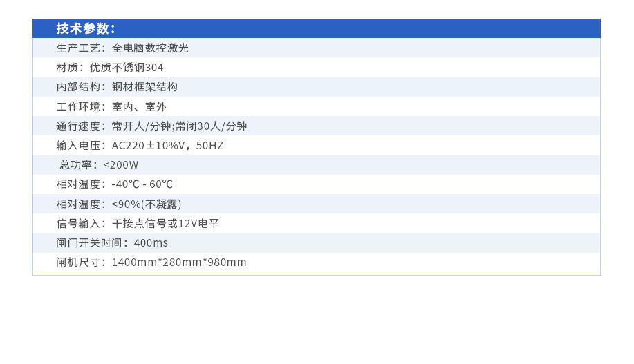 可靠的機芯設計,開關閘門動作輕柔無聲,無機械摩擦。運行平穩,使用壽命長; 翼閘:超高亮閃爍狀方向指示。 可靠的機芯設計,開關閘門動作輕柔無聲,無機械摩擦。運行平穩,使用壽命長。 支持多達32組紅外對射裝置,防止行人非法進入通道、方便行人安全順利通過。 翼閘擁有可靠的安全保護措施,四重防夾設計。A、紅外防夾;B、通行過程邏輯防夾;C、遇阻返回;D、軟門物理防夾。 翼門受到撞擊后,仍可自動復位,并保護機芯。 采用先進的數字傳感儀,電機每轉一圈提供720個信號監測,滿足電機快