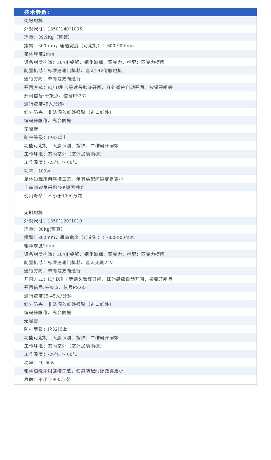 配置機芯:標準速通門機芯、直流無刷24V