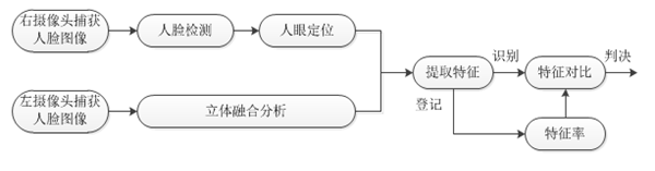 人臉識(shí)別設(shè)備中左攝像頭捕獲人臉圖像,進(jìn)行立體融合分析,專(zhuān)用右攝像頭捕獲到含有人臉的圖像后,對(duì)人臉進(jìn)行臉部的一系列相關(guān)比對(duì)技術(shù),包括人臉檢測(cè)、人眼定位、人臉特征預(yù)處理、記憶存儲(chǔ)和比對(duì)辨識(shí),達(dá)到識(shí)別不同人身份的目的。